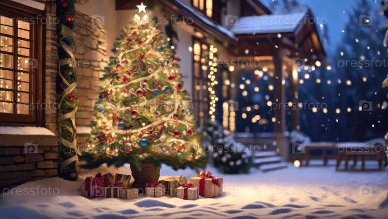 Фея рождественская елка во дворе уютного дома на заднем плане светит теплыми фейриными огнями с золотым декором, коробками с подарками. Рождество и Новый год, праздничное настроение, поздравительная открытка. ИИ генерируется