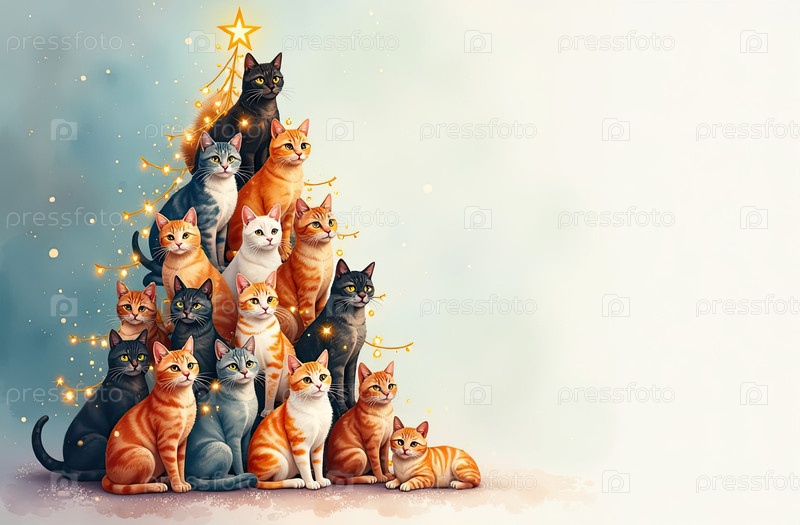 Акварельная рождественская елка из кошек, сделанная на праздничном фоне с блеском, многоцветные сотни кошек складываются в форме высокой рождественской елки с золотыми светящимися гирляндными огнями