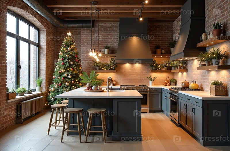 Верхний интерьер уютной современной рождественской кухни, новогоднее настроение, подготовка к празднику, посуда. Рождественский декор современной кухни, снег снаружи окна. ИИ генерируется