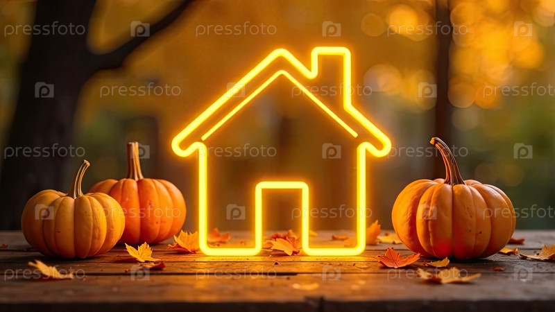 Золотой неон светящийся логотип Крошечный дом с тыквами и желтыми кленовыми листьями на осеннем фоне. Недвижимость, дача, летний домик, ипотека, страхование, бронирование, строительство, изоляция. ИИ генерируется