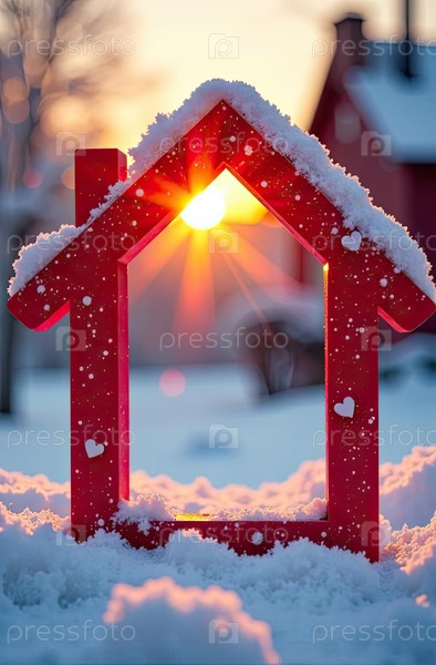 Уютный каркас крошечный дом на снегу и заснеженном фоне в солнечных лучах, с рождественским декором. недвижимость, риэлторская деятельность, ипотека, страхование, бронирование, зимовка, изоляция, отопление. ИИ генерируется