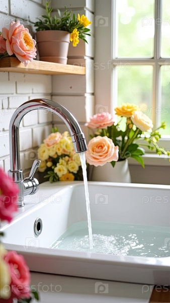 Ближайшая вода течет из крана в большую белую раковину цветочного магазина, окруженную массивом цветов. Цветочный бизнес, свежерезанные цветы, 8 марта, весна, день рождения. ИИ генерируется