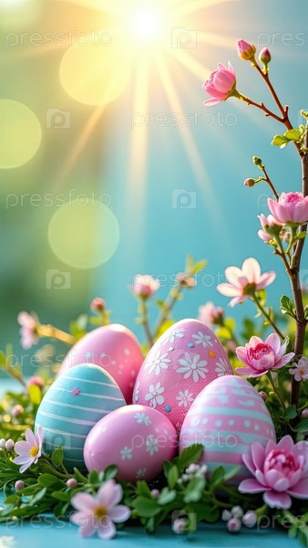 Пасхальные яйца украшены узорами, полосами, волнами, точками солнечных лучей, украшаются весенними пастельными цветами на весенне-синем фоне