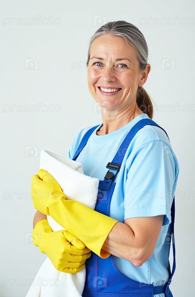 Портрет взрослой белокожей женщины в синем фартуке и желтых резиновых перчатках с тряпкой в руке возле белой стены со свободным местом для текста, услуги очистки окон, уборки дома, горничной