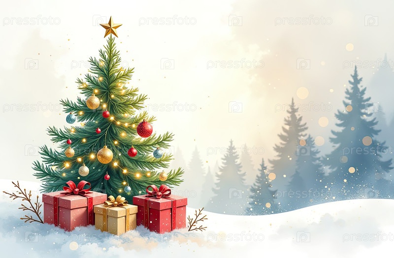 Акварельная зеленая рождественская елка и коробки для подарков на сияющем фоне. поздравительные открытки на Рождество и Новый год с копировальным пространством. созданный ИИ