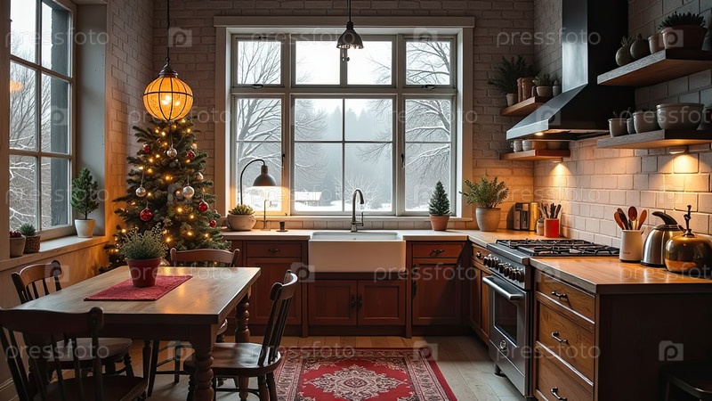 Верхний интерьер уютной современной рождественской кухни, новогоднее настроение, подготовка к празднику, посуда. Рождественский декор современной кухни, снег снаружи окна. ИИ генерируется