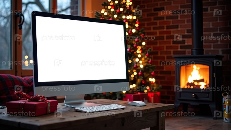 Монитор домашнего компьютера с белым экраном макет на столе в уютном домашнем офисе рождественского декора, елки и горящего камина с гирляндами