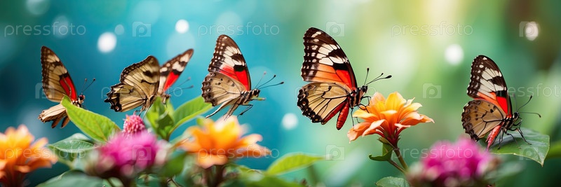 Бабочки над летними цветами, ярко-синее небо, пустое пространство для копирования, тропический сад, идеально подходит для текста, объявления или слогана