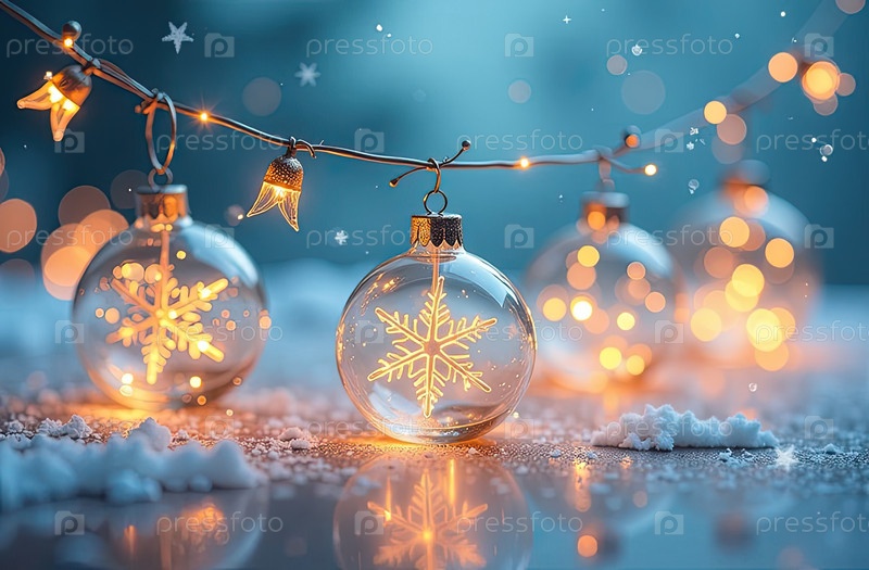 Гирлянда светящихся прозрачных шаров с золотыми огнями на синем фоне с блеском и боке. поздравительная карточка на Рождество и Новый год. ИИ генерируется