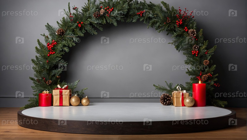 Пустая подиумная площадка для демонстрации продукта, дисплейный монтаж с рождественским декором, боке, секины и фейры. Копирование пространства, Рождество и Новый год. ИИ генерируется