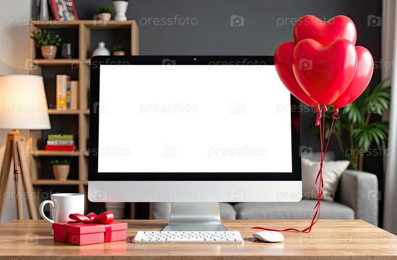 Компьютерный монитор с белым экраном макет на столе в уютном домашнем офисе с красными шарами в форме сердца, подарок, горшочные растения, книжная полка. День святого Валентина подарок, дата, романтика. ИИ генерируется