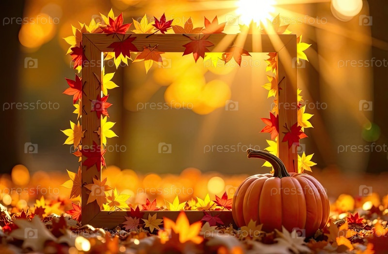 Рама украшена желтыми кленовыми листьями на осеннем фоне с тыквой в лучах солнца. баннер урожая и Хэллоуин, флаер с копировальным пространством. ИИ генерируется