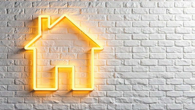 Прозрачное золото светящийся символ дома на фоне белой кирпичной стены. недвижимость, риэлтор, ипотека, страхование, бронирование, строительство, изоляция, отопление. AI generated