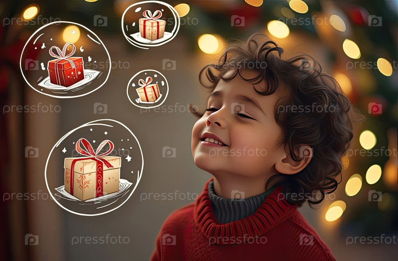 Криклый мальчик в красном шерстяном свитере мечтает о подарках на Новый год - большие мультфильмы, нарисованные кругами со символами подарков внутри