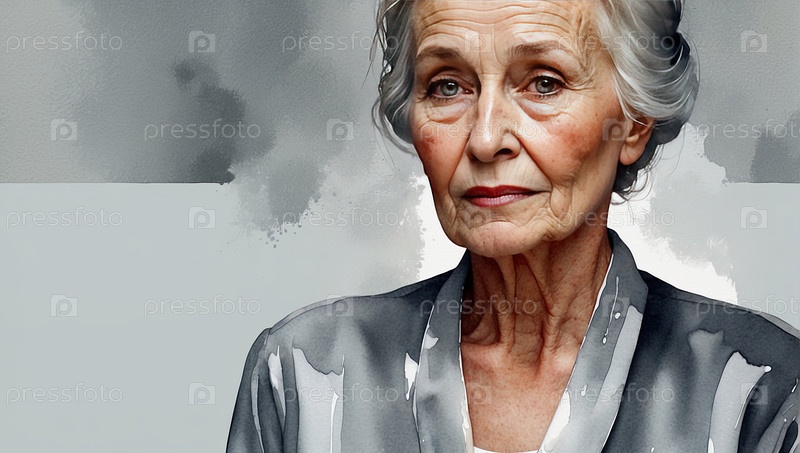 Акварельная иллюстрация пожилой женщины с седыми волосами в серебряной блузке, художественный портрет на сером фоне, элегантный стиль, положительное старение, творческая красота