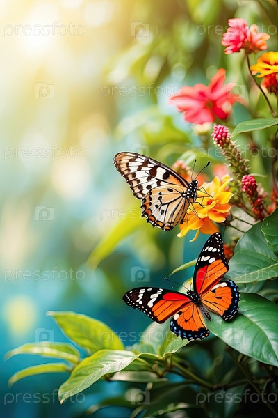 Бабочки на лиственничном тропическом кусте, яркое летнее солнце, мягкий пастельный фон и приглашающее пространство для копирования объявлений или текстов