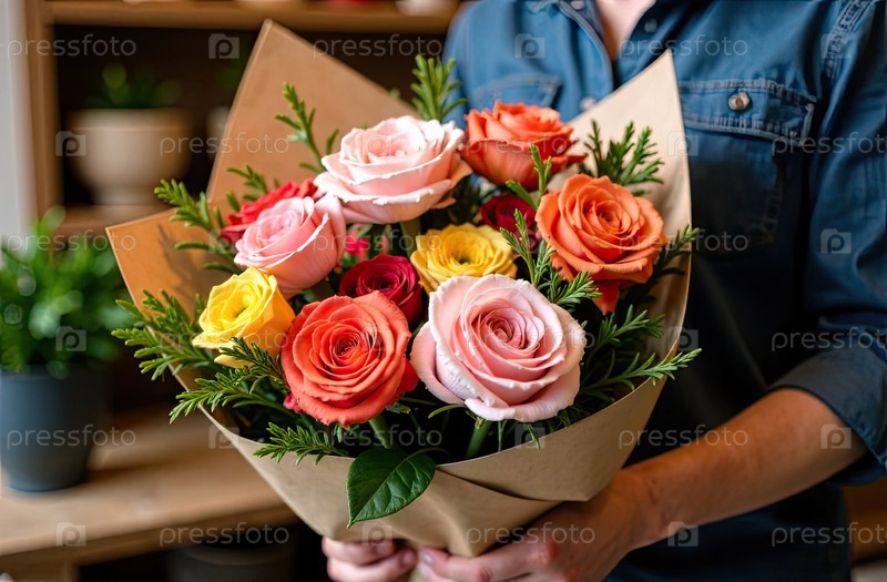 Букет роз и весенних цветов в руках флориста, упакованный в крафт-бумагу в интерьере цветочного магазина, доставка на праздник.Весна, 8 марта, женский день, день рождения. ИИ сгенерировано