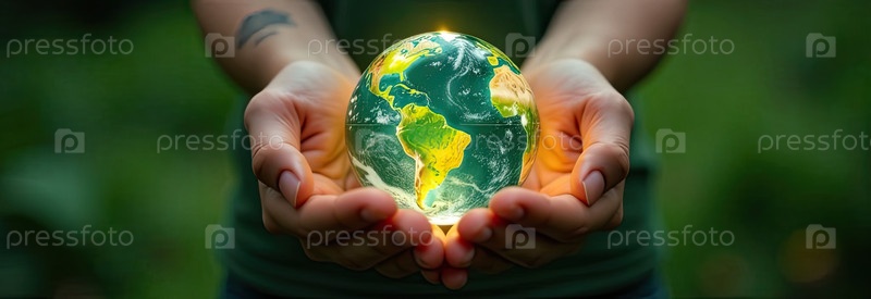 Стеклянная светящаяся сфера планеты Земля На ладонях находится шар с внутренним микроклиматом, заботой о планете, чистой окружающей среде, защитой экологии, географии, континентов, путешествий