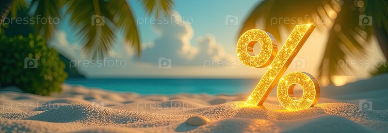Яркий золотой процентный знак на берегу моря с тропическими пальмами в свете солнца, туристический морской фон. жаркая летняя распродажа и скидки, горящий тур-баннер, флаер. ИИ генерируется