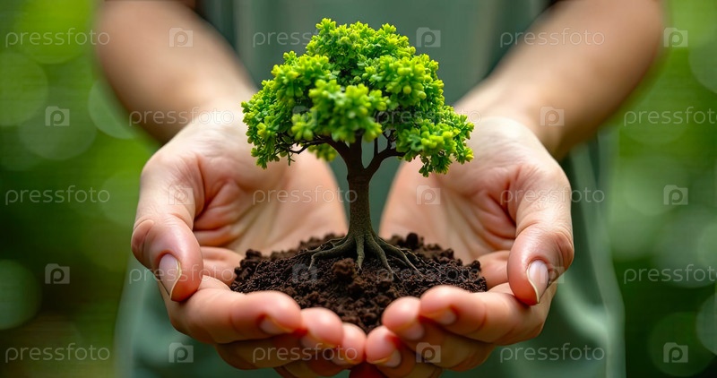 Крошечное зеленое дерево в горстке земли в руке в земле на близком расстоянии.Экология, уход, бонсай.Искусственный интеллект создан