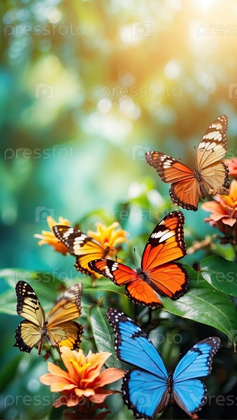 Вертикальные бабочки на фоне джунглей, тропические цветы, яркие цвета и пространство для копирования текста, слогана или брендинга
