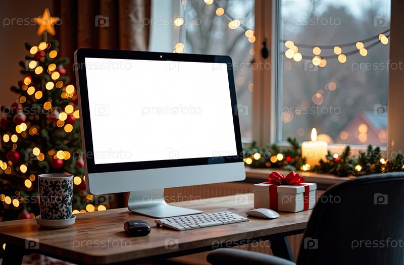 Компьютерный монитор с белым экраном макет на столе в уютном домашнем офисе рождественского декора с елкой и окном со снежной зимой снаружи