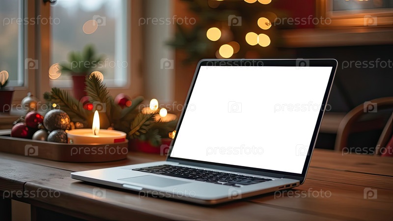 Ноутбук с белым экраном макет на столе в уютном домашнем офисе рождественского декора в стиле лофт