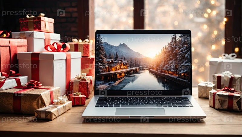 Ноутбук с рождественскими обоями на столе в офисе в торговом центре Рождественский декор с сумками, торговыми пакетами, посылками, Черной пятницей, Новым годом
