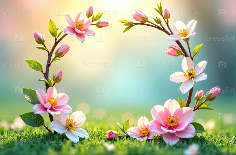 Весенняя тематическая декоративная рама с текстом внутри в солнечных лучах, украшена весенними пастельными цветами на весенне-синем фоне