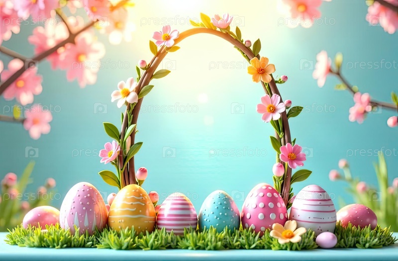 Декоративная рама на тему пасхальных яиц с текстом внутри в солнечных лучах, украшена весенними пастельными цветами и пятью большими пасхальными яйцами, украшенными узорами, полосами, волнами, точками