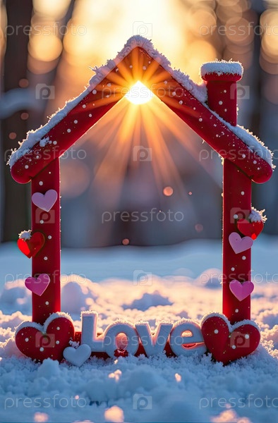 Уютный красный крошечный дом на снегу в солнечных лучах, украшенный красным сердцем и декором Валентина