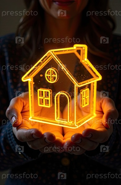 Золото светящийся символ уютного дома В ладонях рук с золотым блеском. Недвижимость, риэлтор, ипотека, страхование, бронирование, изоляция, мечта о собственном доме. ИИ генерируется
