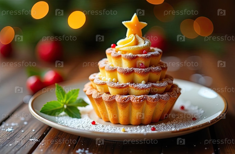 Вкусные выпечки печенье в виде рождественской елки из ягод, листьев мяты на праздничном новогодном столе. Рецепт и красивая презентация. Рождественский декор и установка стола. ИИ генерируется