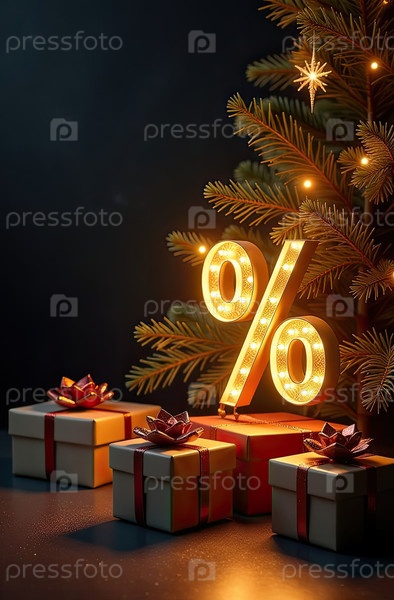 Неон светящийся золотой процентный знак на рождественском фоне с елкой, блесками и коробками для подарков. витрина магазина в Черную пятницу, Новый год, Рождественская распродажа, скидки. баннер, флаер. ИИ генерируется