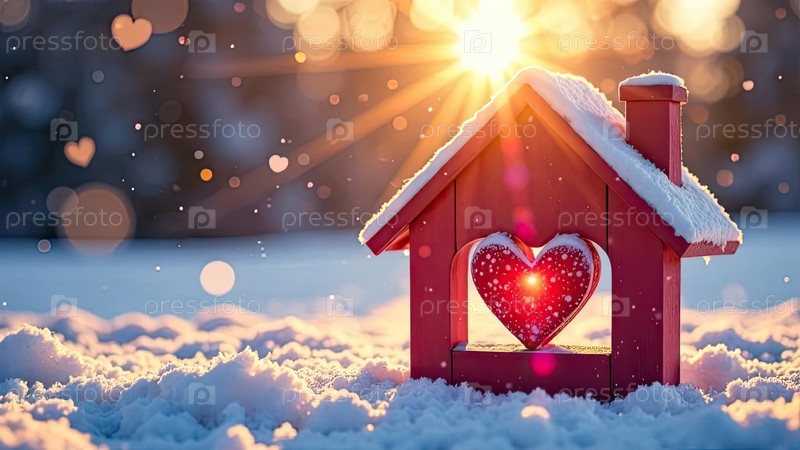 Уютный красный крошечный дом на снегу в солнечных лучах, украшенный красным сердцем и декором Валентина