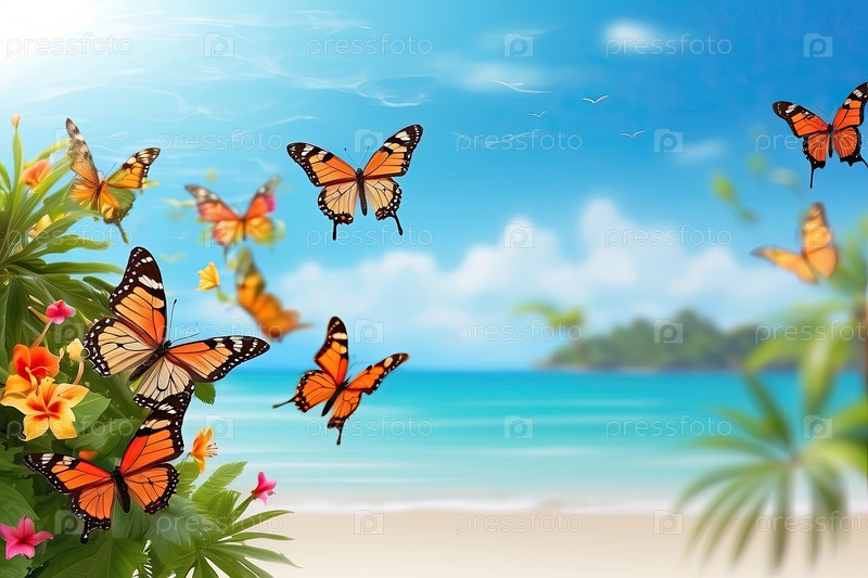 Таблица оранжевых бабочек с цветами гибискуса, летним голубым морем и пустым копировальным пространством для вашего сообщения, объявления или приветствия