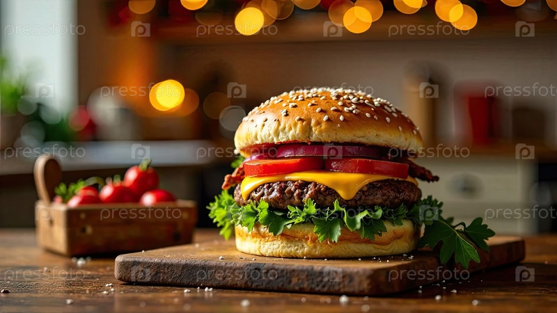 Вкусные бургеры и картофель фри в домашней кухне с рождественским декором, огнями гирлянды. доставка из ресторана быстрого питания, меню гамбургера домашнее приготовление на Новый год. ИИ генерируется;