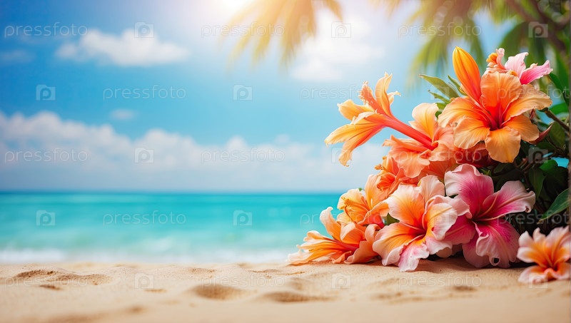 Приморский фон с тропическими цветами, золотой песком и бирюзовой водой, широкое пространство для копирования текста, шаблон летнего отдыха