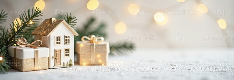 Золото-белый символический дом и подарочная коробка под рождественской елкой на столе Рождественский фон с золотым блестком на поздравительной карточке