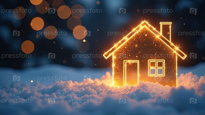 Прозрачное золото светящийся символ дома на снегу и заснеженном фоне с золотым блеском. недвижимость, риэлтор, ипотека, страхование, бронирование, зимовка, изоляция, отопление. ИИ генерируется