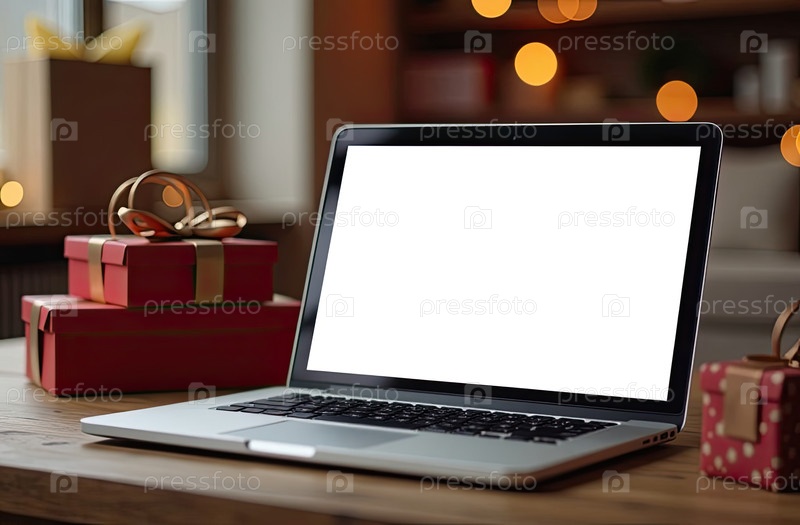 Ноутбук с белым экраном макет на столе на фоне рождественского декора уютного помещения с елкой, фейриными огнями