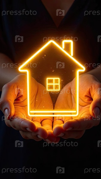 Золото светящийся символ уютного дома В ладонях рук с золотым блеском. Недвижимость, риэлтор, ипотека, страхование, бронирование, изоляция, мечта о собственном доме. ИИ генерируется