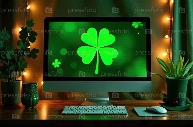Ноутбук с зеленым клевером на экране в волшебном декоре ко Дню Святого Патрика. Сезонная дистанционная работа, интернет, рождественская карточка, шопинг, удача, зеленый дом. ИИ генерируется