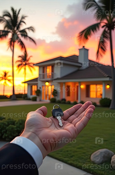Рука риэлтора с ключами от дома для пляжного отдыха в жарких тропиках с пальмами. Резервации гостиниц, бронирование, переезд в новый дом, ипотека, аренда и покупка недвижимости. ИИ генерируется