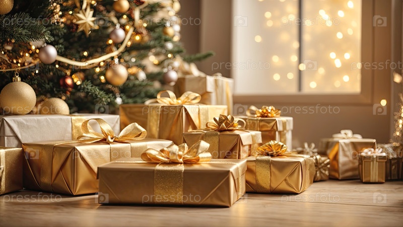 Рождественский фон с подарочными коробками с луками в ярких золотых тонах, боке и фейри-светом, рождественская елка во внутреннем интерьере дома. Праздничное настроение Рождество и Новый год, открытка. ИИ генерируется