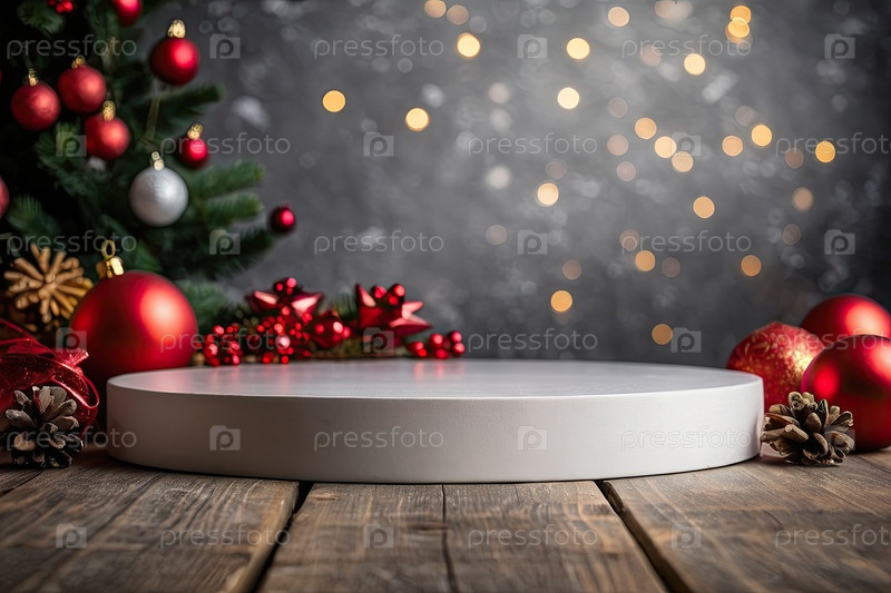 Пустая подиумная площадка для демонстрации продукта, дисплейный монтаж с рождественским декором, боке, секины и фейры. Копирование пространства, Рождество и Новый год. ИИ генерируется