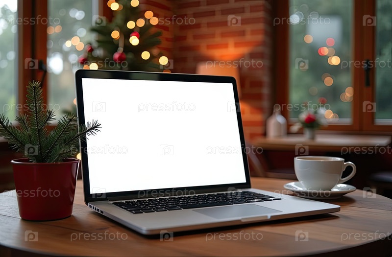 Ноутбук с белым экраном макет на столе в уютном кафе в стиле лофт со стаканом кофе, домашний офис рождественского декора