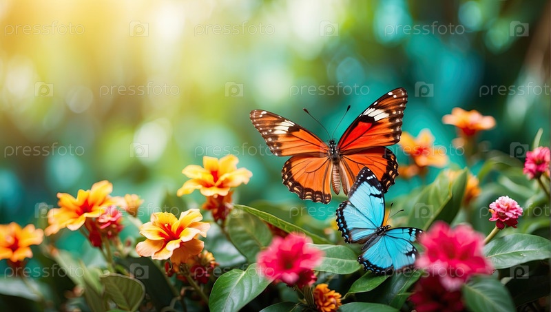 Тропические бабочки, летящие над цветами, зеленый искрящийся сад, летнее копировальное пространство для слогана или текстового сообщения