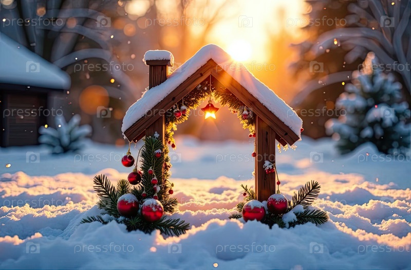 Уютный каркас крошечный дом на снегу и заснеженном фоне в солнечных лучах, с рождественским декором. недвижимость, риэлторская деятельность, ипотека, страхование, бронирование, зимовка, изоляция, отопление. ИИ генерируется