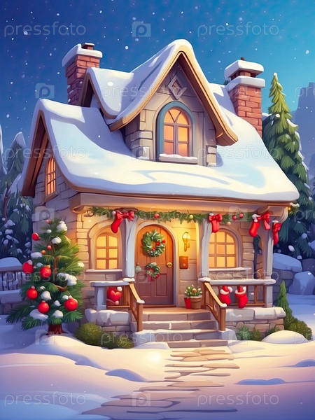 Мультфильм Уютный деревянный дом в горах ночью с рождественскими елками и подарками зимой на снегу и снегопаде с Рождественским декором - праздничная открытка
